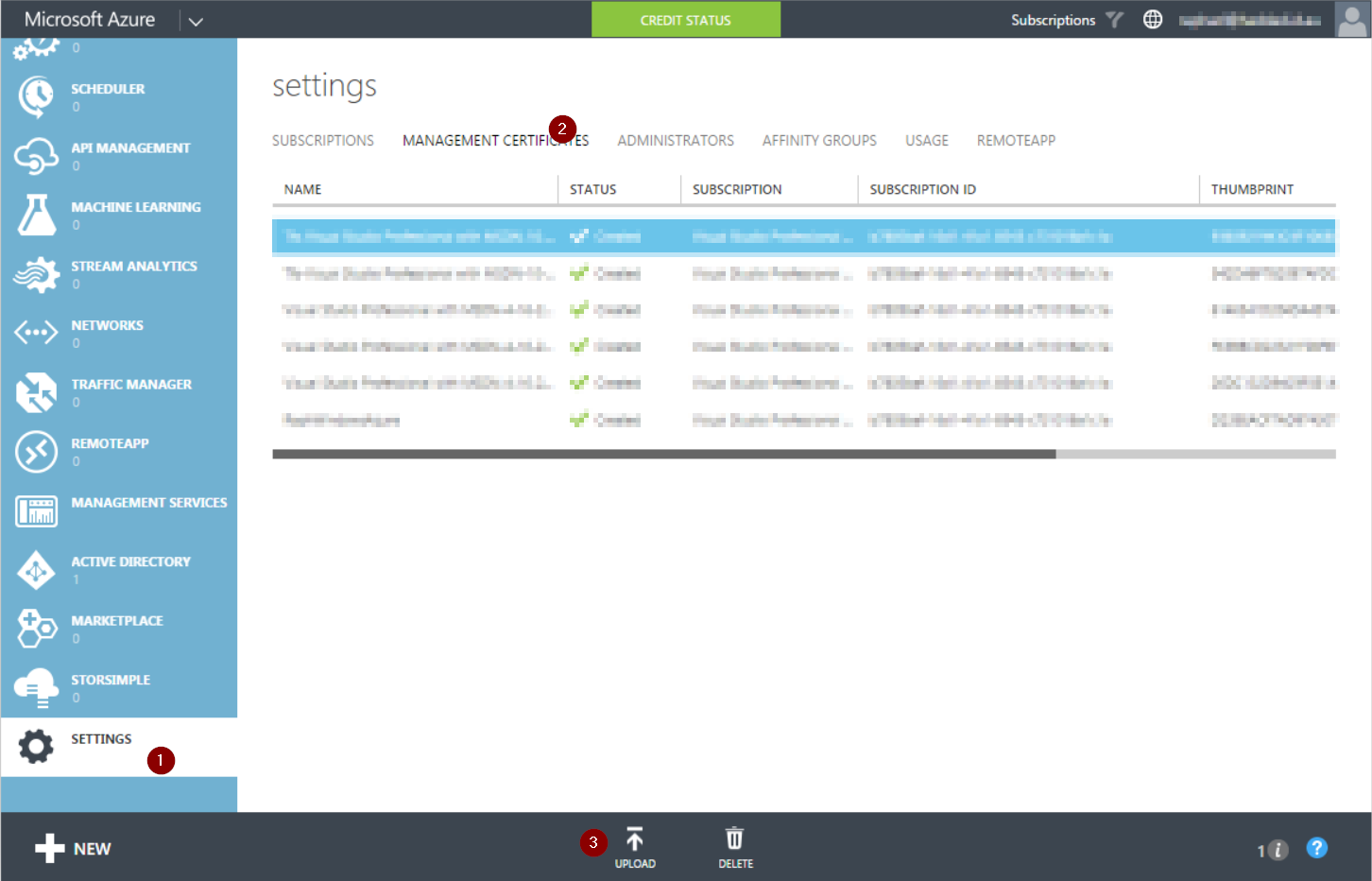 Once uploaded you should see your management certificate appear and you will be able to run the PowerShell script below. You should be able to see the SubscriptionId and Thumbprint from the first screenshot from step 6.