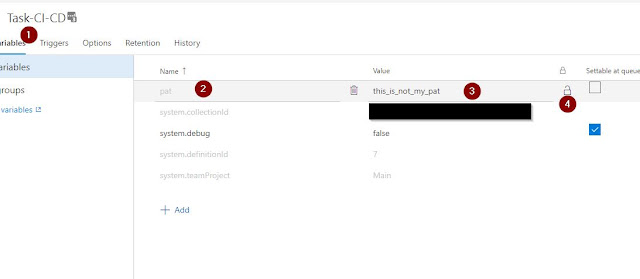 After you’ve done this, you’ll need to add a custom variable to your definition. Add your pat (which you created previously) as a secret variable: