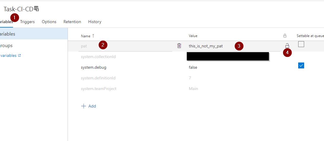 After you’ve done this, you’ll need to add a custom variable to your definition. Add your pat (which you created previously) as a secret variable: